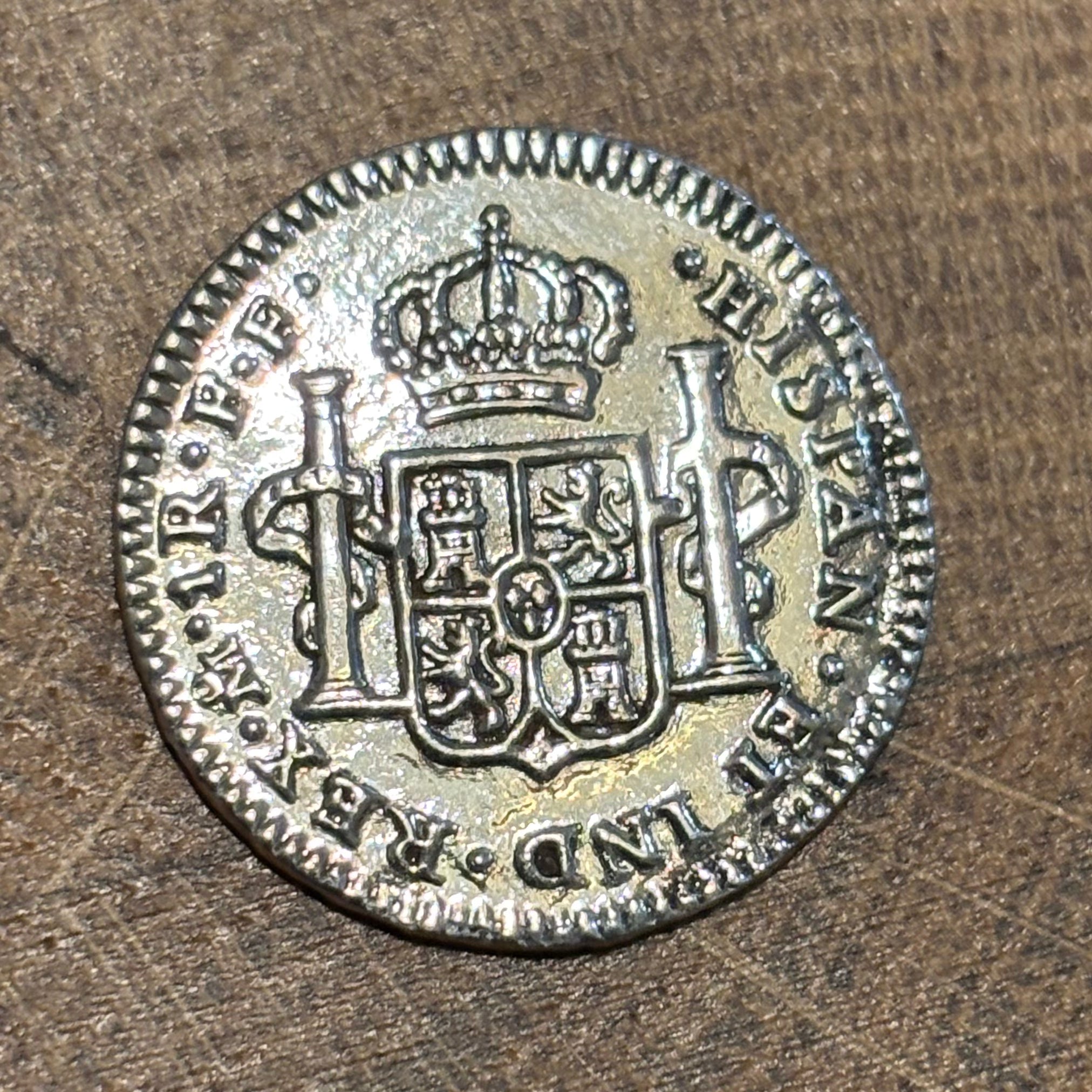 Description: Spanish Cob from the wreck of the El Cazador. Obverse: Legend (Carolus III – DEI GRATIA). Translation: “By the grace of god”. Bust of Carolus III facing left. Reverse: Shield between two Pillars (Pillars of Hercules). Legend: (HISPAN ET IND REX). Translation: “By the Grace of God, King of Spain and the Indies”.