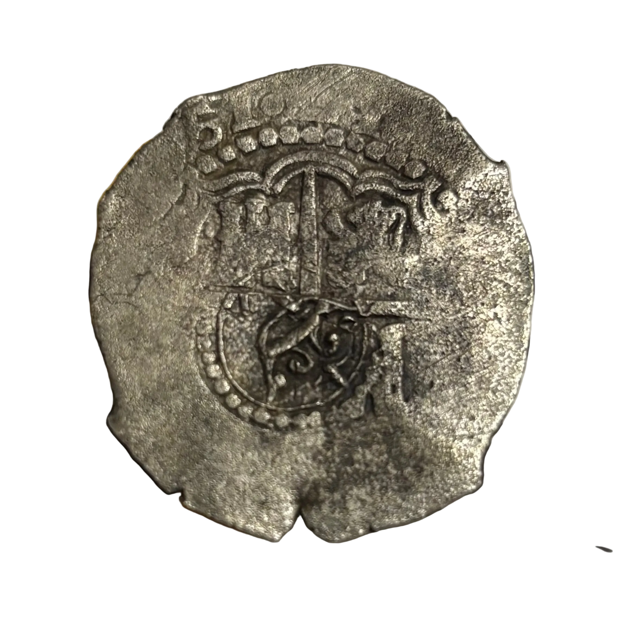 Description: Heavy environmental wear. Obverse: Bold Crown mark in center of Greek cross. Date on XX51 partially visible. Lions and castles visible in three quadrants.