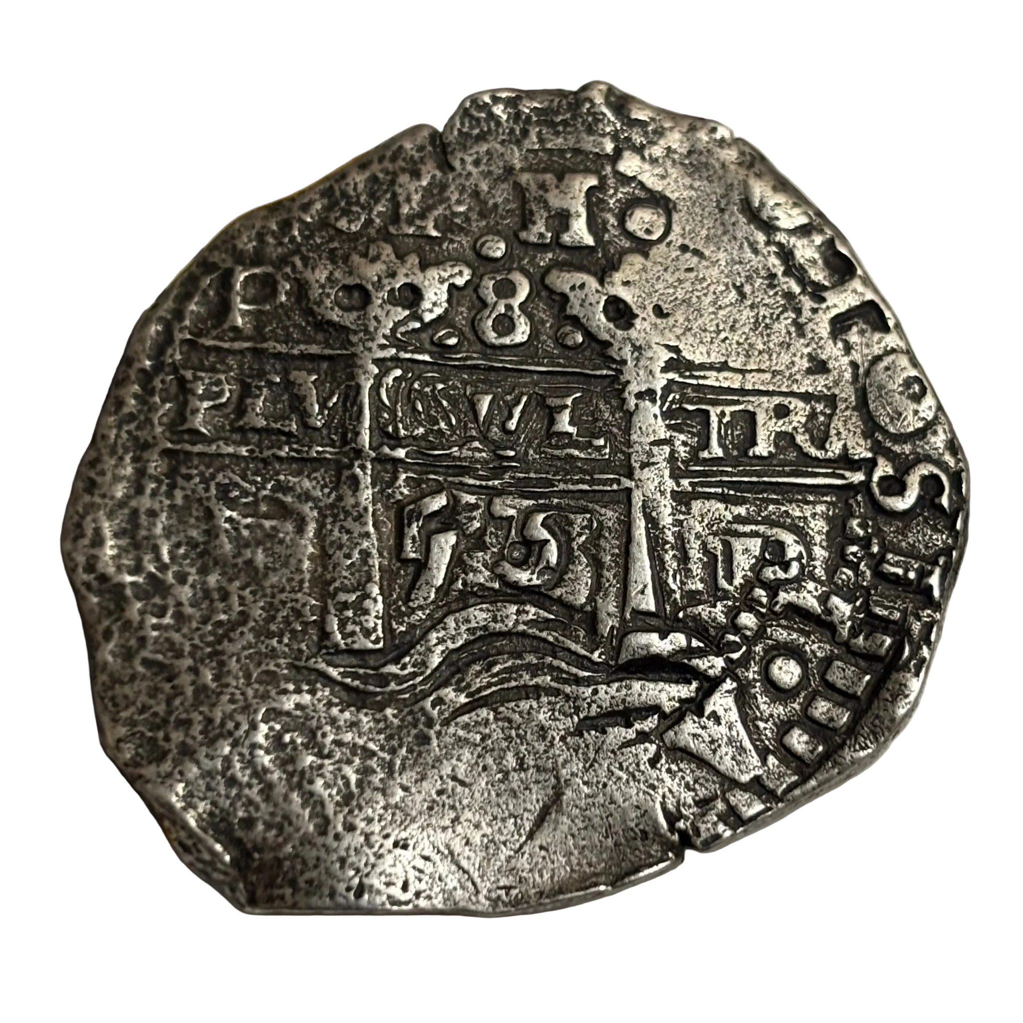 Description: Type VIII Transitional cob. Obverse: boldly struck with Most major marks visible; denomination 8, Plus-ultra across the middle, Mint and Assayer marks, along with some legend around the edges. Reverse: Clear date of 653. Mininmal ocean wear with lions and castles visible in all quadrants.