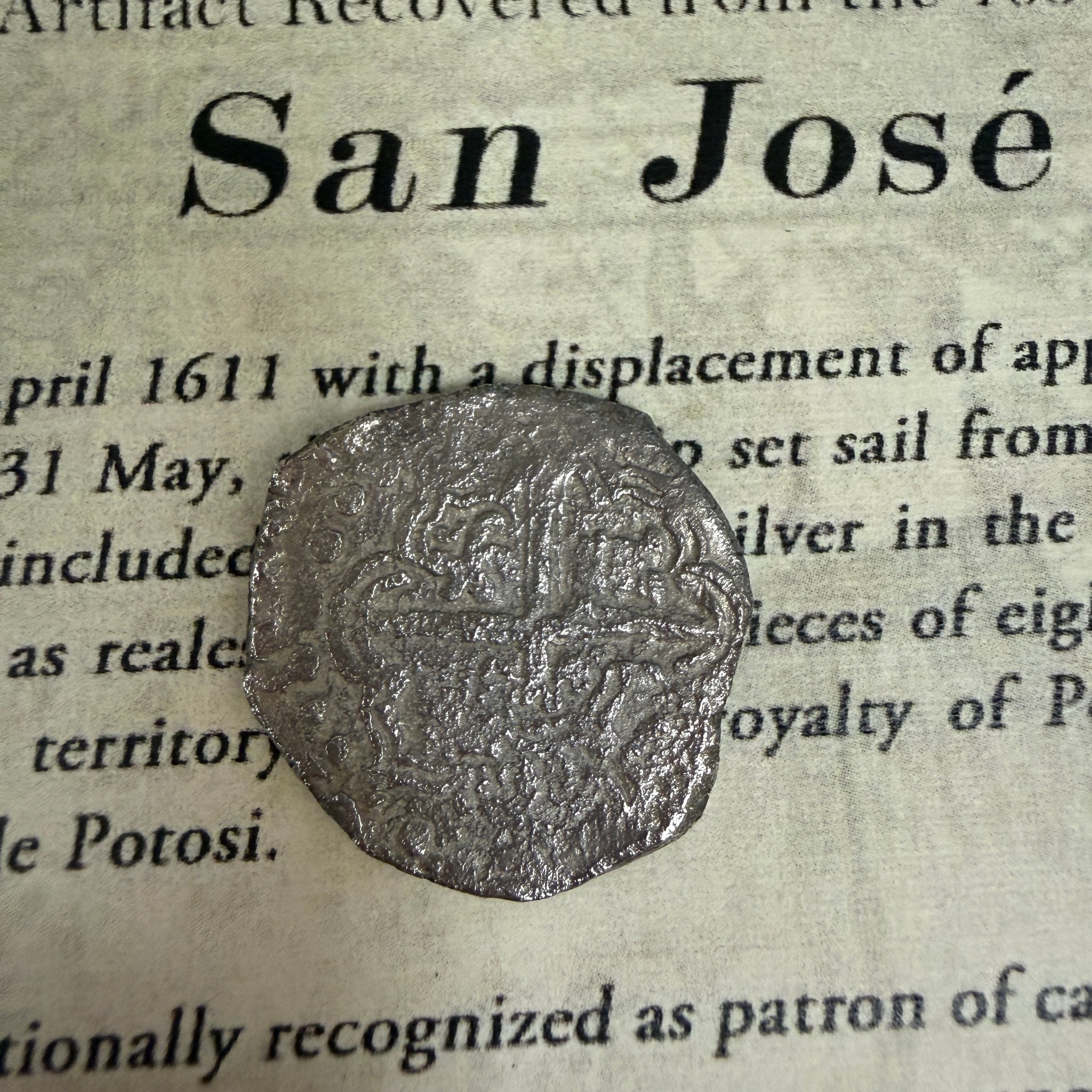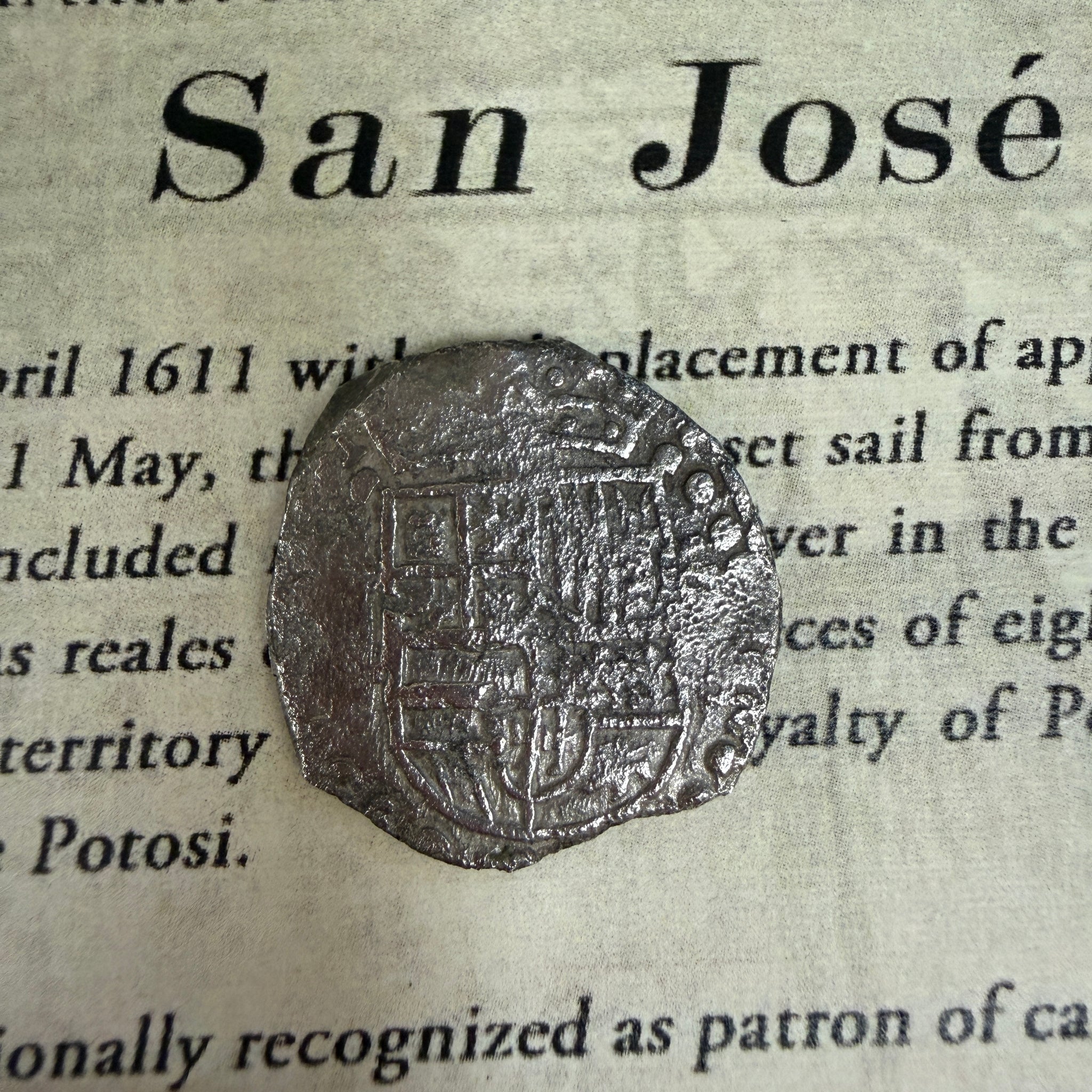 History: The galleon San José was christened on April 25, 1611 with a displacement of approximately 700 tons and was the Almirante of the South Seas Armada of 1631. On May 31st, the aging ship set sail from Callao, the port of Lima, Peru, loaded with precious cargo. Her vast riches included nine tons of silver in the form of 1,417 bars and 416 individual wooden chests of silver coins, known as reales de ocho, or pieces of eight weighing in at 51 tons. Most of the silver originated from Potosi, then a territory of the Viceroyalty of Peru, today of Bolivia, where it was mined from a virtual mountain of silver called Cerro Rico de Potosi.