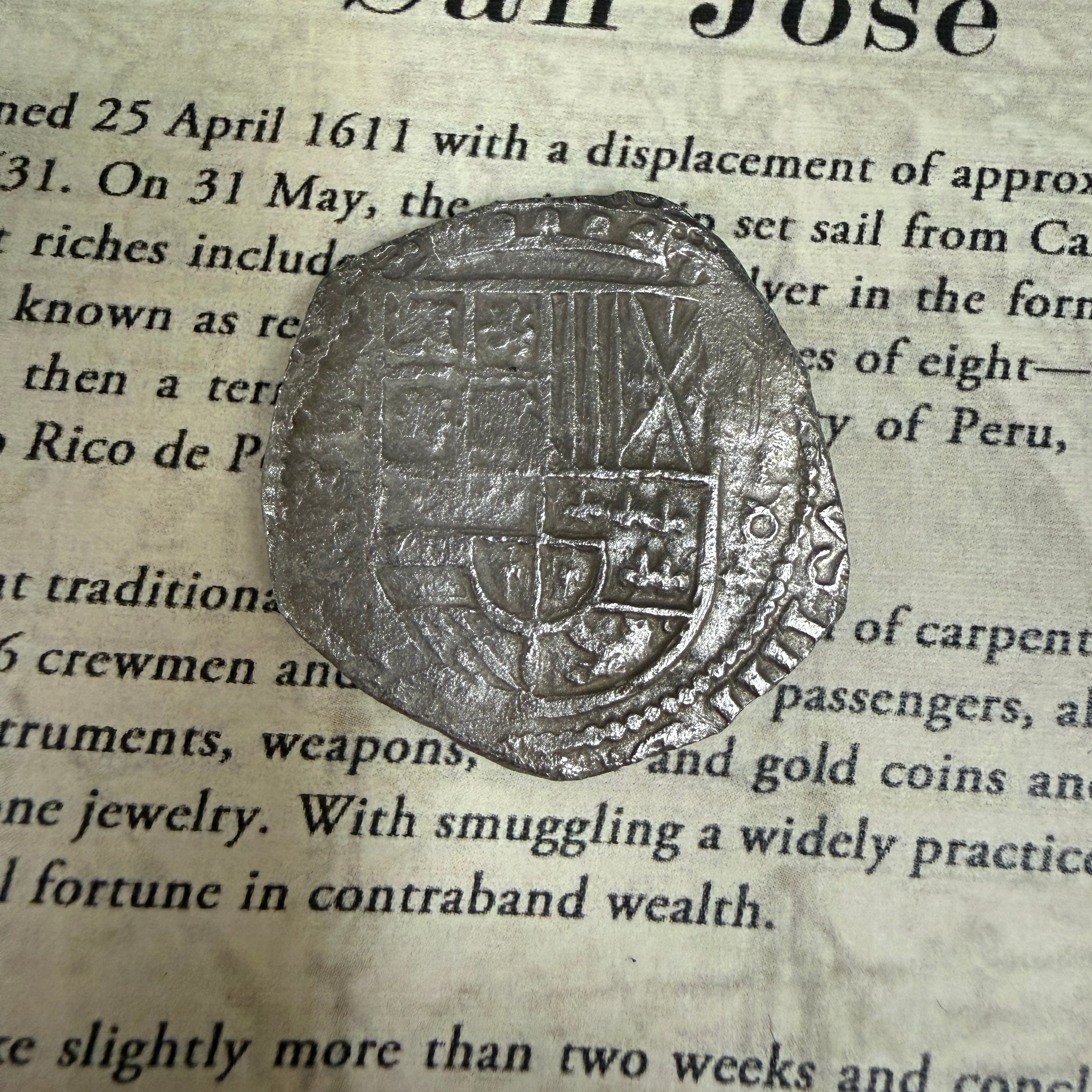 History: The galleon San José was christened on April 25, 1611 with a displacement of approximately 700 tons and was the Almirante of the South Seas Armada of 1631. On May 31st, the aging ship set sail from Callao, the port of Lima, Peru, loaded with precious cargo. Her vast riches included nine tons of silver in the form of 1,417 bars and 416 individual wooden chests of silver coins, known as reales de ocho, or pieces of eight weighing in at 51 tons. Most of the silver originated from Potosi, then a territory of the Viceroyalty of Peru, today of Bolivia, where it was mined from a virtual mountain of silver called Cerro Rico de Potosi.