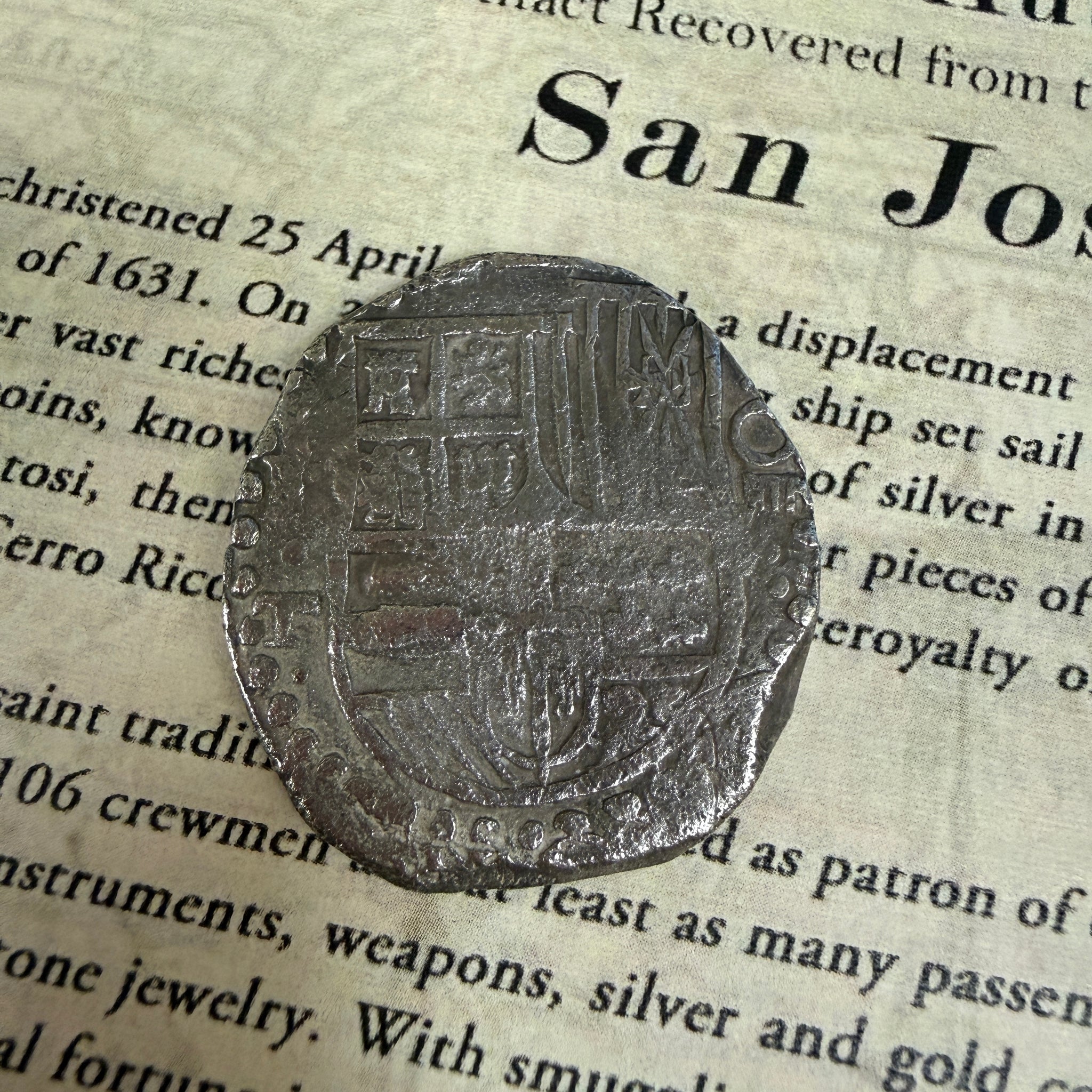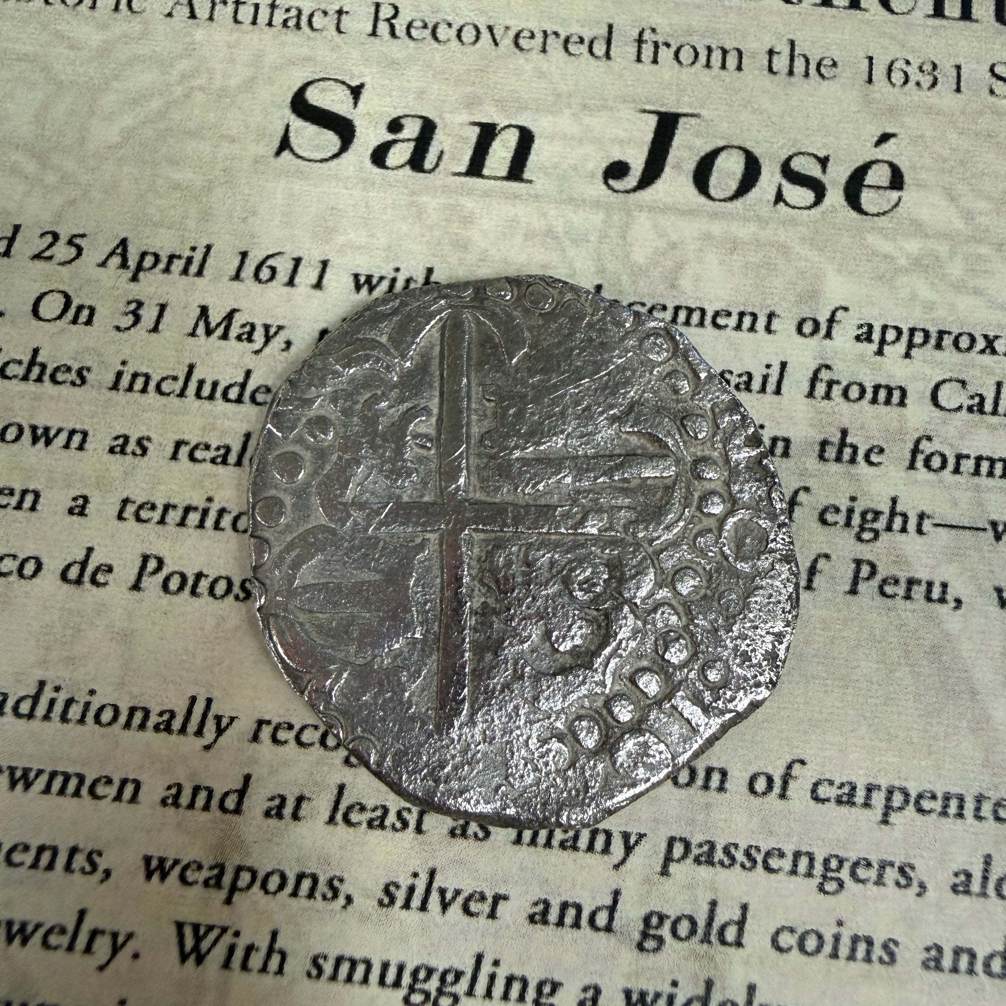 History: The galleon San José was christened on April 25, 1611 with a displacement of approximately 700 tons and was the Almirante of the South Seas Armada of 1631. On May 31st, the aging ship set sail from Callao, the port of Lima, Peru, loaded with precious cargo. Her vast riches included nine tons of silver in the form of 1,417 bars and 416 individual wooden chests of silver coins, known as reales de ocho, or pieces of eight weighing in at 51 tons. Most of the silver originated from Potosi, then a territory of the Viceroyalty of Peru, today of Bolivia, where it was mined from a virtual mountain of silver called Cerro Rico de Potosi.
