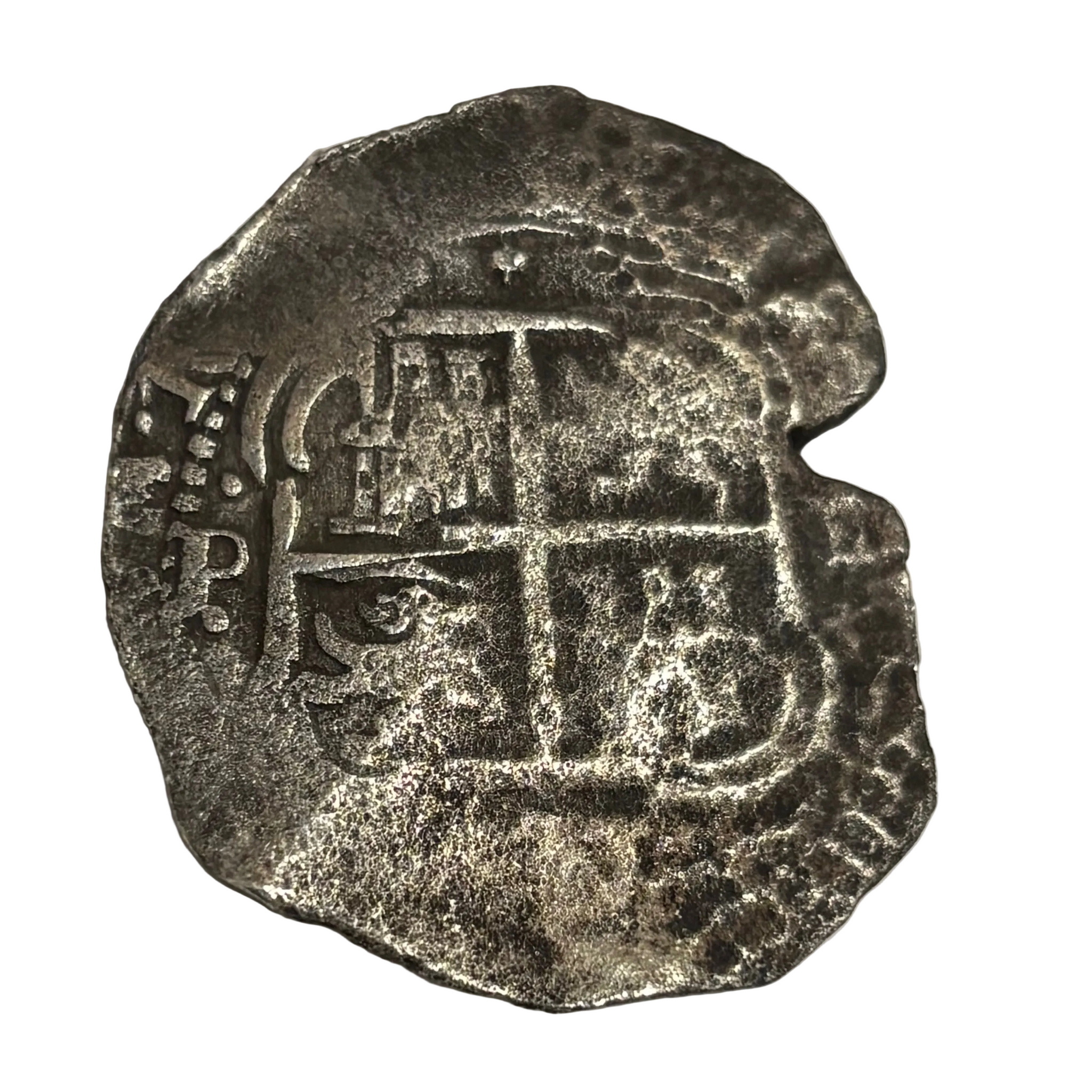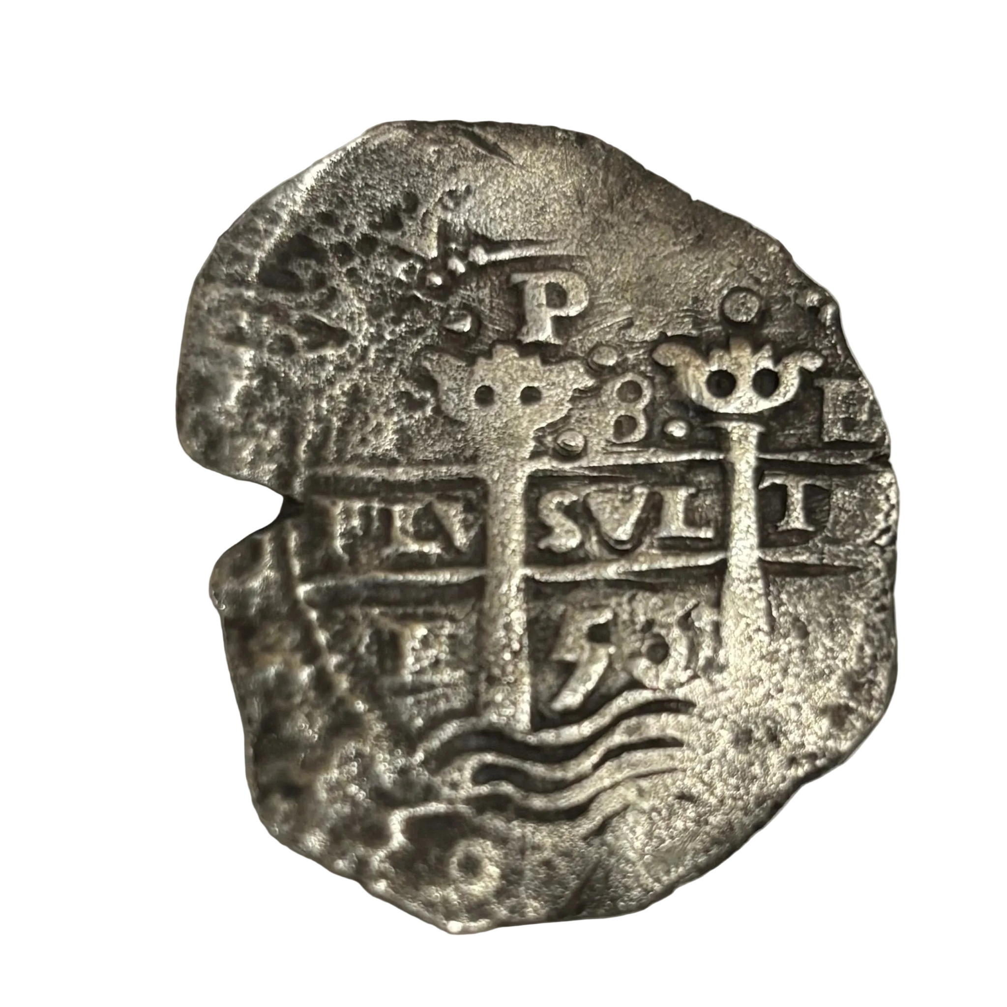 Description: Obverse: Type VIII Pillar and Wave design. Visible date of 1653 twice. Plus Ultra visible across the middle (here and beyond). Assayer initial and Mint mark visible along with denomination 8 across the top. Reverse: Clear strike on Jerusalem cross appears to be a broken die as well. Lions and Castles visible in four quadrants. Mint mark and Assayer initials visible.